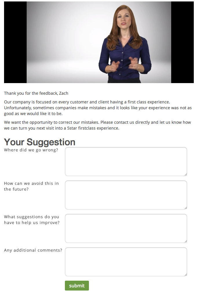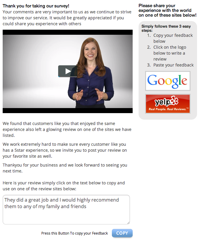 Once your customer has submitted their review they will be presented with a follow up page. This will be a page customized to the type of review (positive or negative) that someone entered into the system: